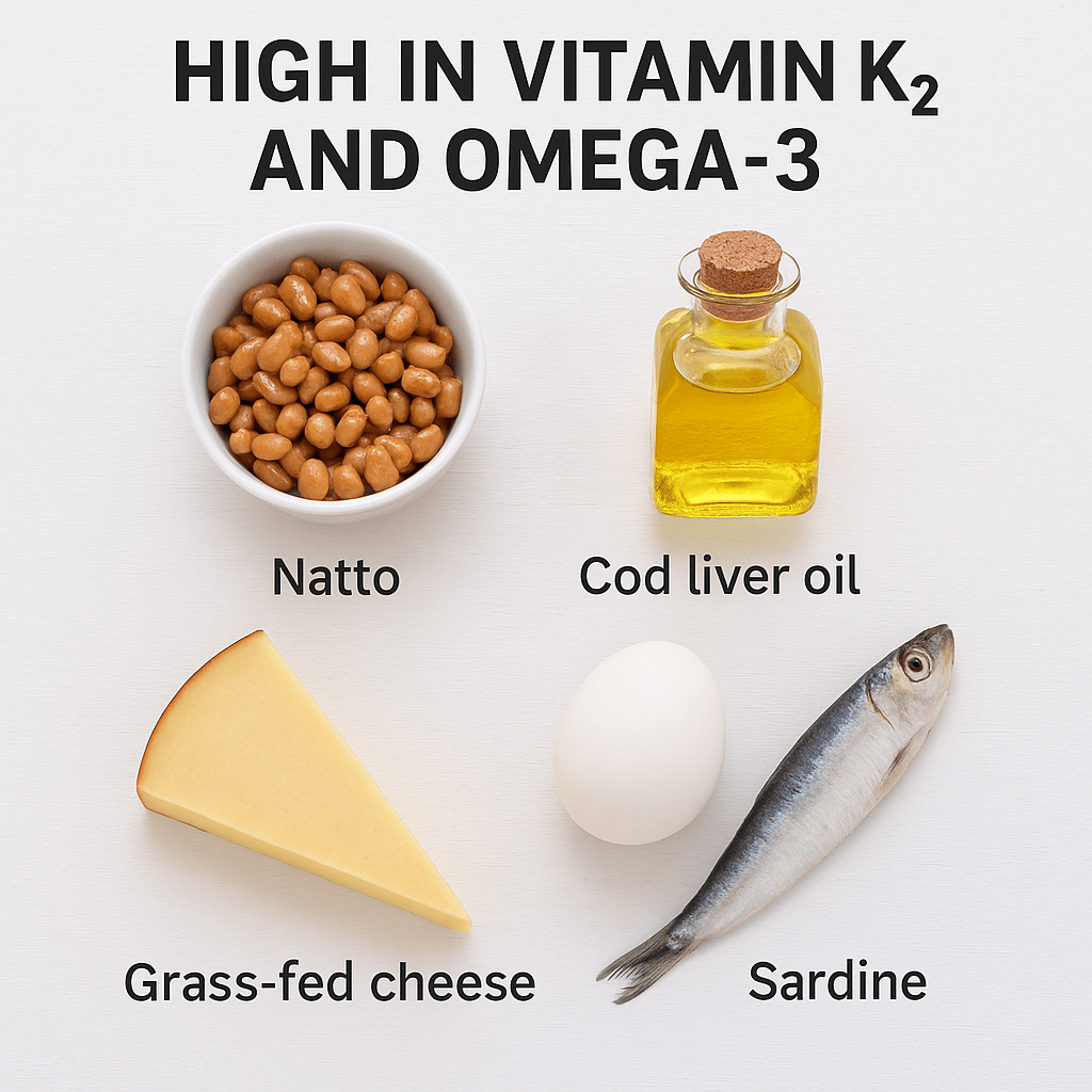 Foods like grass fed butter and cheese, pasture raised eggs, sardines and nato are also rich in vitamin K2 and omega-3’s. These are essential for optimal bone, heart, and brain health, working to reduce inflammation and direct calcium into bones to support long term vitality.